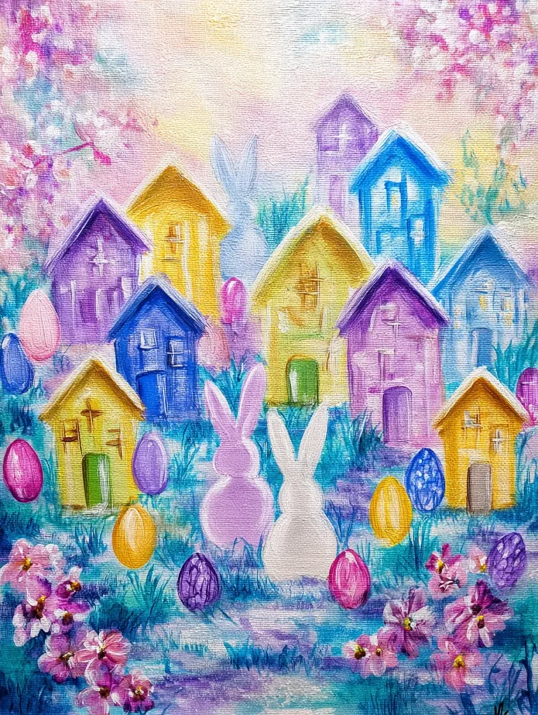 Whimsical Easter Village with Pastel Bunnies