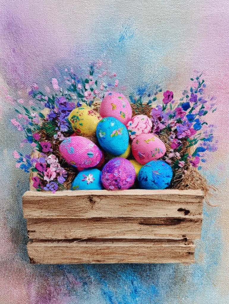 A sturdy wooden crate sits at the center of this piece, packed with festive eggs and wispy wildflowers. The palette features bold fuchsia, bright turquoise, and soft yellow eggs decorated with dainty petals. Purple and pink blooms sprout from the nest of straw, adding height to the composition. A hazy blend of pastels in the background makes the crisp lines of the wooden slats stand out beautifully.