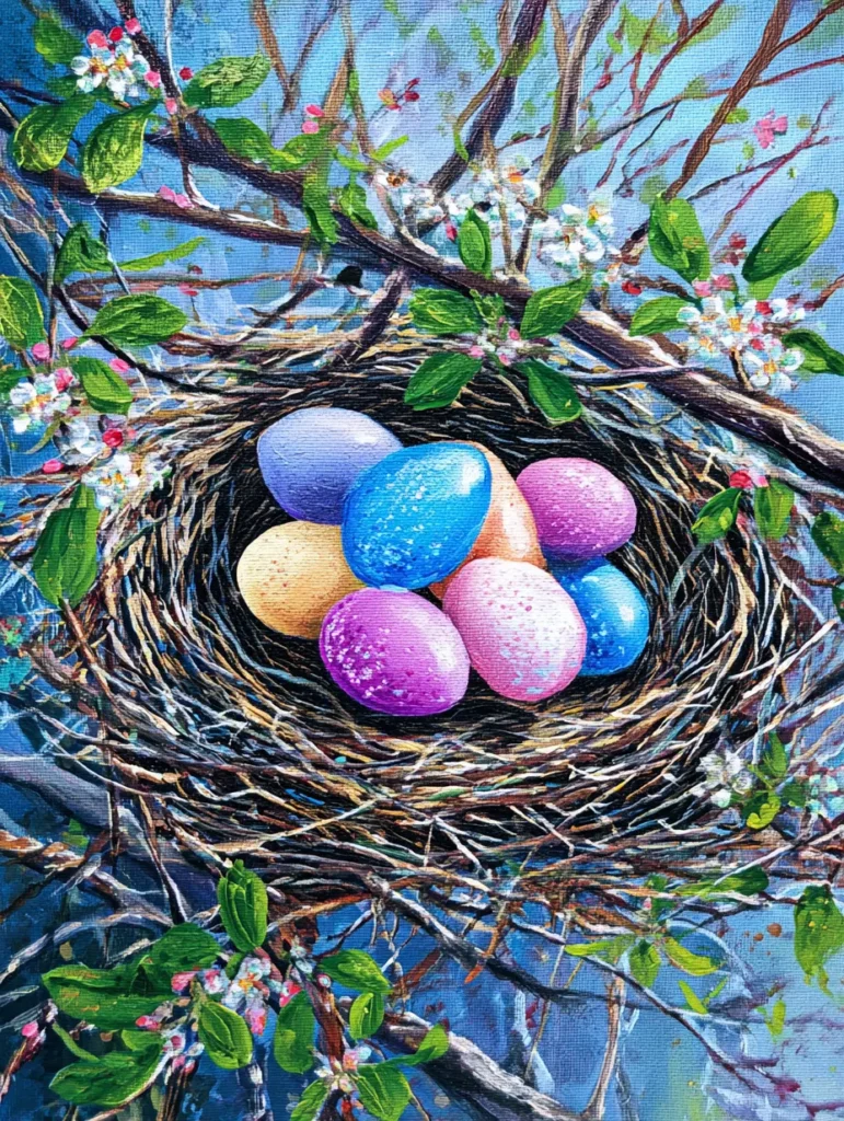 This painting has a detailed bird nest woven from tangled brown and tan twigs, resting securely among flowering spring branches. Inside the nest sits a collection of vibrant eggs in shades of magenta, sky blue, and buttery yellow, each finished with a shimmering, speckled texture. The layout is framed by delicate green leaves and white blossoms against a cool blue background, using a mix of fine lines for the nest and softer dabs of paint for the floral details.