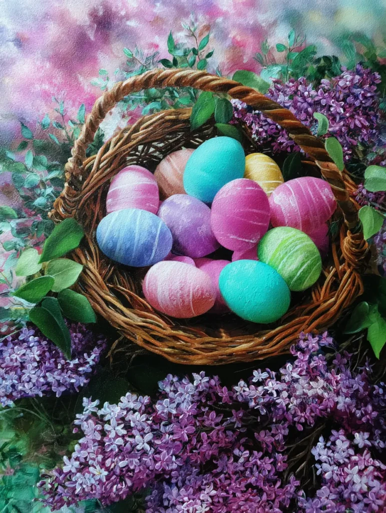 This beautiful design features a woven brown basket overflowing with a colorful assortment of Easter eggs in shades of sky blue, candy pink, and lime green. Each egg has delicate white wisps and swirls that suggest a hand-painted marble effect. The basket is nestled among deep purple lilac clusters and vibrant green leaves, set against a dreamy background of blended rose and teal hues. The brushwork on the lilacs is particularly lovely, using small dabs of paint to create that signature clustered look, while the basket shows off detailed circular strokes to mimic real wicker texture.