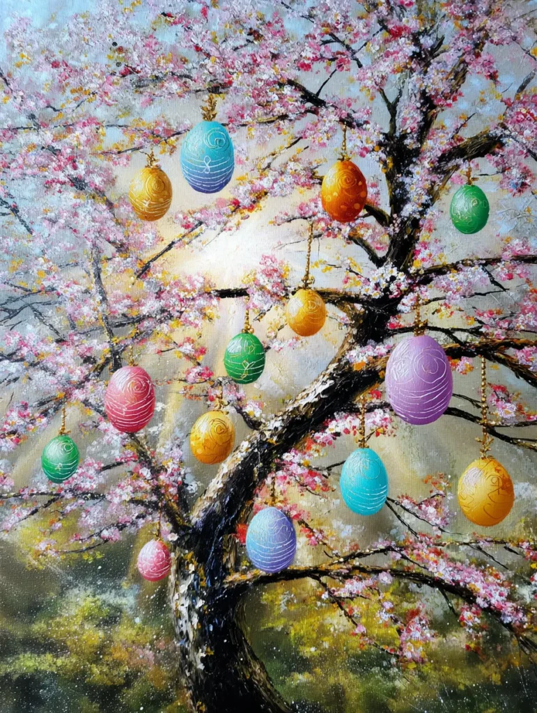 This whimsical painting features a majestic cherry blossom tree with dark textured bark and branches heavy with frothy pink and white flowers. Hanging from the sturdy limbs are numerous decorated Easter eggs in vivid shades of marigold, sky blue, emerald, and lilac, each adorned with delicate gold filigree and swirling white patterns. The background is a soft blend of golden sunlight and hazy garden greens, creating a magical glow that highlights the tree as the central focus. Thick, impasto-style brushstrokes on the blossoms add a wonderful 3D effect, while the fine lines on the eggs provide a lovely contrast in detail and precision.