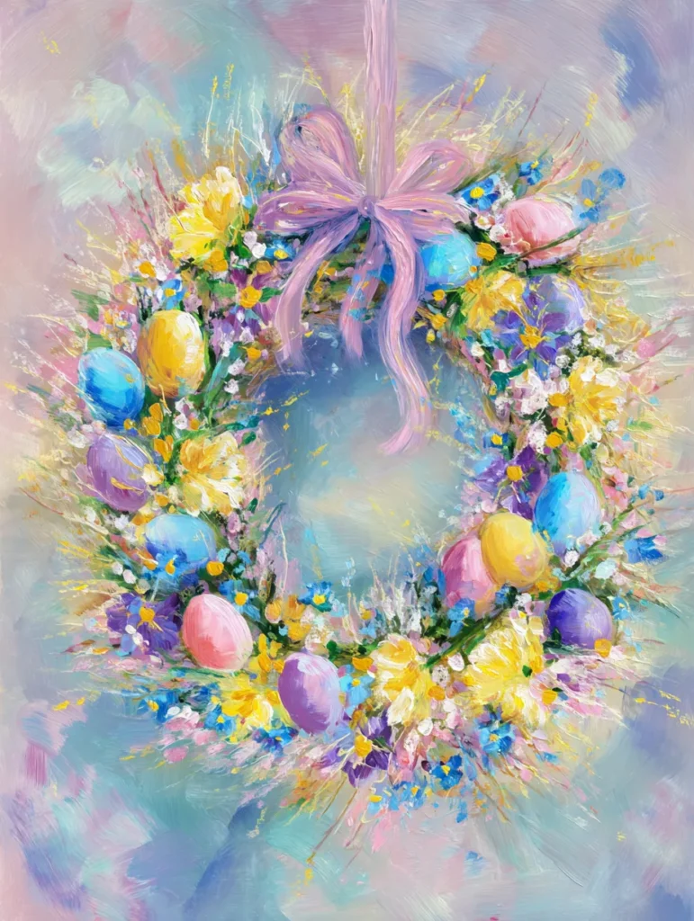 This stunning wreath design features a flurry of loose and expressive brushwork that creates a soft, impressionistic look. A circle of sunny yellow blooms, purple wildflowers, and tiny white filler buds is accented by smooth Easter eggs in pastel blue, pink, and lemon yellow. The entire arrangement is tied together with a flowing lavender ribbon at the top, while the background consists of dreamy, blended strokes of mint and lilac. Using quick, gestural movements with a round brush allows the wreath to look airy and full of movement rather than stiff or overly structured.