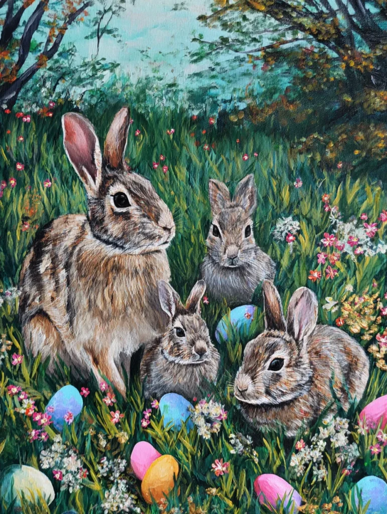I think this project is a total joy because you get to practice painting such expressive little faces and soft textures. Working on the different layers of the grass while tucking in those vibrant eggs is a really engaging way to build depth on your canvas. If you love animals and want to create something that feels extra heartwarming for the holiday, this design is a fantastic choice. It is a wonderful way to slow down and enjoy the process of adding those tiny, detailed highlights to the bunnies’ ears and eyes.