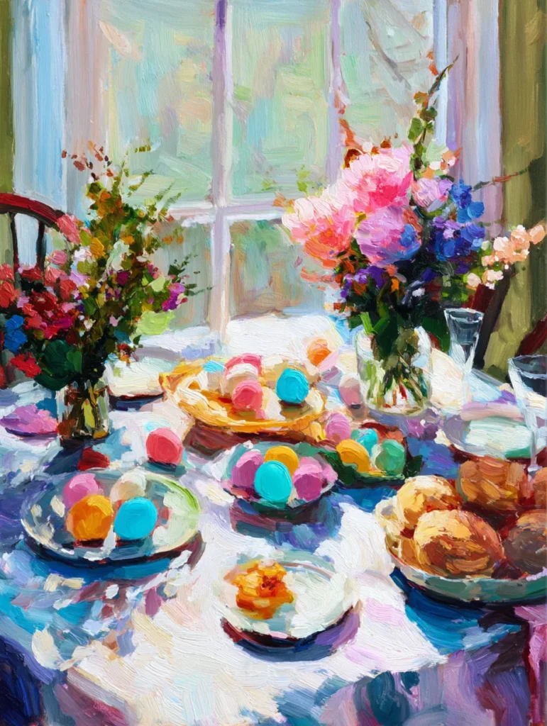 This impressionistic still life captures a festive table spread bathed in soft morning light pouring through a window. The scene is filled with vibrant plates of pink, turquoise, and yellow Easter eggs, alongside fresh floral bouquets and warm bread rolls. Thick, confident brushstrokes create a wonderful sense of texture and movement, especially in the white tablecloth and the dappled shadows. The layout uses a high-angle perspective to showcase the abundance of the meal, while the background window is rendered with soft, vertical strokes of mint and lavender to keep the focus on the foreground details.