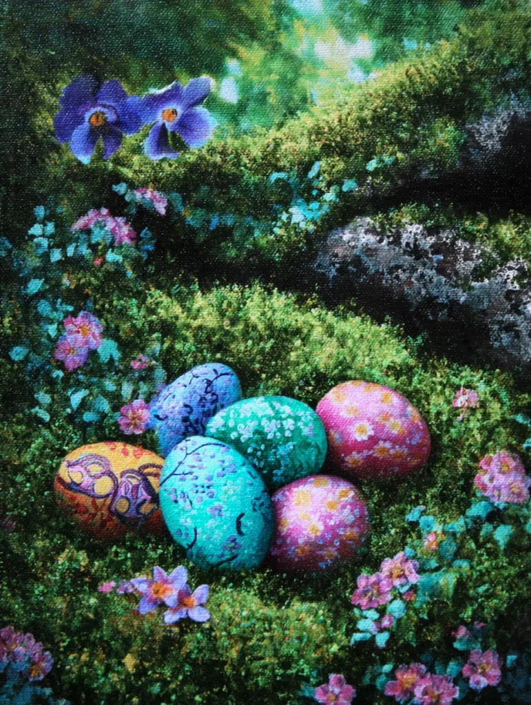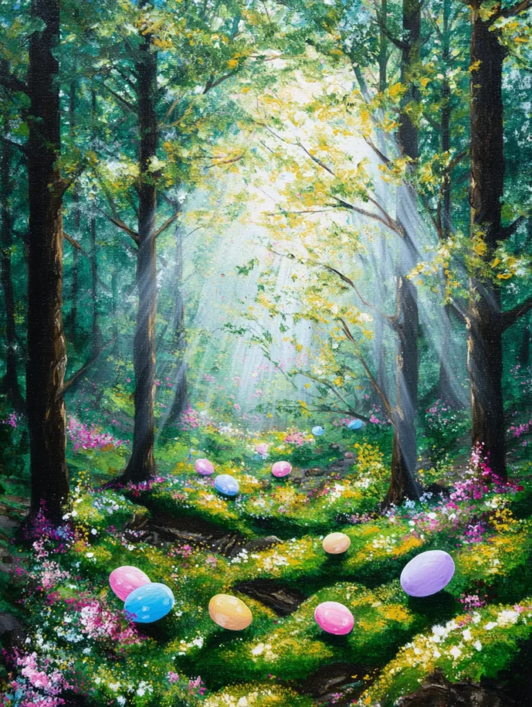 I think there is something truly meditative about painting those delicate rays of light breaking through the trees. It is a fantastic way to play with contrast, especially when you nestle those glossy eggs into the dark, earthy shadows of the forest floor. If you want a project that feels like a peaceful getaway, this magical landscape is a lovely choice for your next creative session. Using different shades of green to build up the mossy ground is surprisingly satisfying and gives the whole piece a rich, organic feel.