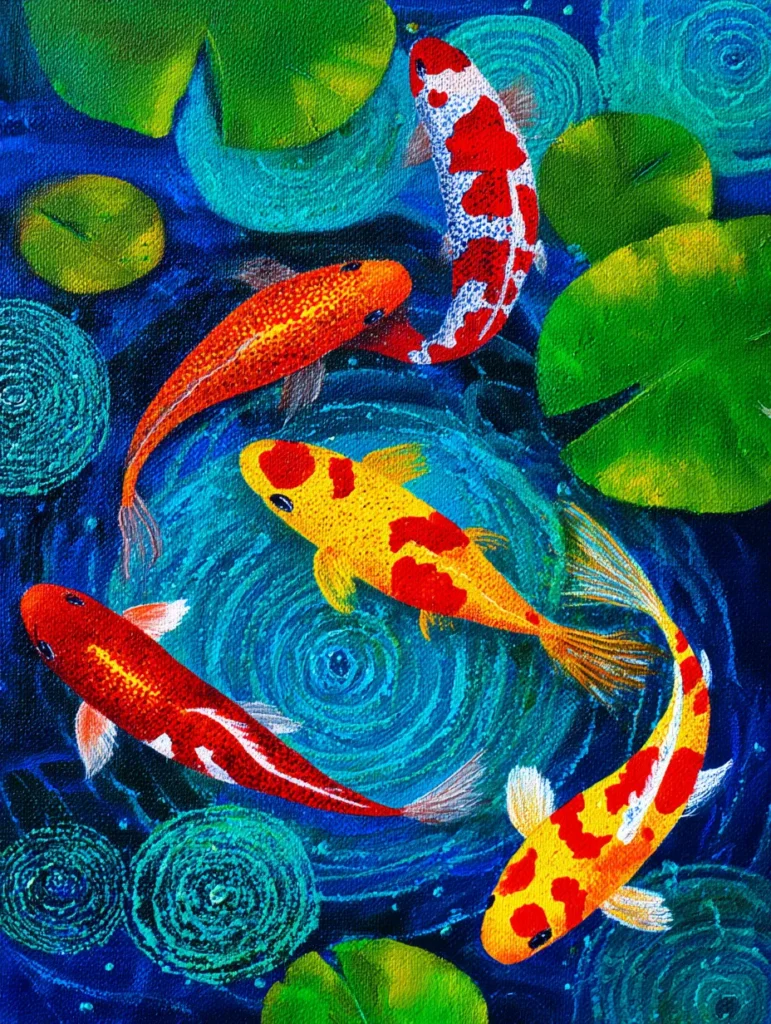 This vibrant piece captures a collection of colorful koi fish swimming through deep blue, swirling water. The composition is balanced by bright green lily pads floating on the surface, while the fish themselves pop with bold patterns of white, orange, red, and yellow. To add depth, the water is painted with layered, circular brush strokes that suggest ripples and movement, making the scene feel dynamic rather than static. The high-contrast palette makes the glowing skin of the fish look like they are truly illuminated from below, creating a rich and intricate look that feels deceptively detailed.