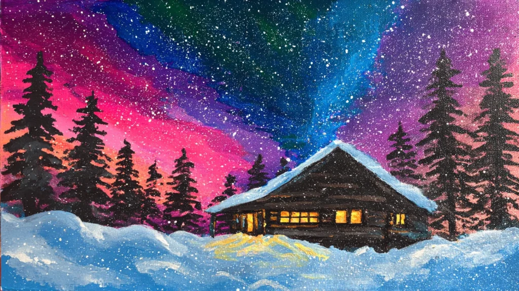 I absolutely adore how this design makes something as complex as a night sky feel so achievable with just a few simple techniques. It is incredibly rewarding to layer those deep, vivid colors and then flick a bit of white paint on top for the stars—it feels like real magic is happening on your canvas. This is the perfect project to try when you want to create a sense of peace and wonder, and it is honestly so much fun to see the cabin windows start to glow with that warm, inviting orange. It is a fantastic way to capture that cozy, winter-night feeling without needing years of practice.