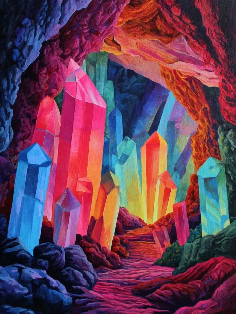 This breathtaking scene invites you into a hidden underground world filled with towering, glowing crystals. The composition plays with intense light and shadow, using a saturated palette of electric blues, vibrant pinks, and fiery oranges to bring the jagged rock formations to life. Each crystal has clean, geometric edges that catch the light, while the floor of the cavern features soft, textured brushwork that looks like smooth, glowing stone. It is a fantastic example of how layering bright, opaque colors against dark, moody backgrounds can create a sense of deep perspective and wonder.