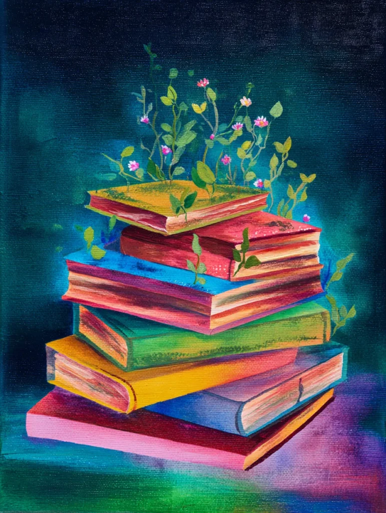 This whimsical design features a precariously balanced stack of old, colorful books that seem to have sprouted their own little garden. Each spine displays a different vibrant shade like bright yellow, deep red, or soothing teal, and delicate green vines with tiny pink flowers twist and grow right out of the pages. The background is a moody, atmospheric blend of dark navy and purple, which helps the stack of books stand out as the central focus. Using a mix of clean lines for the books and soft, loose strokes for the foliage creates a beautiful balance between structure and nature that feels truly magical.