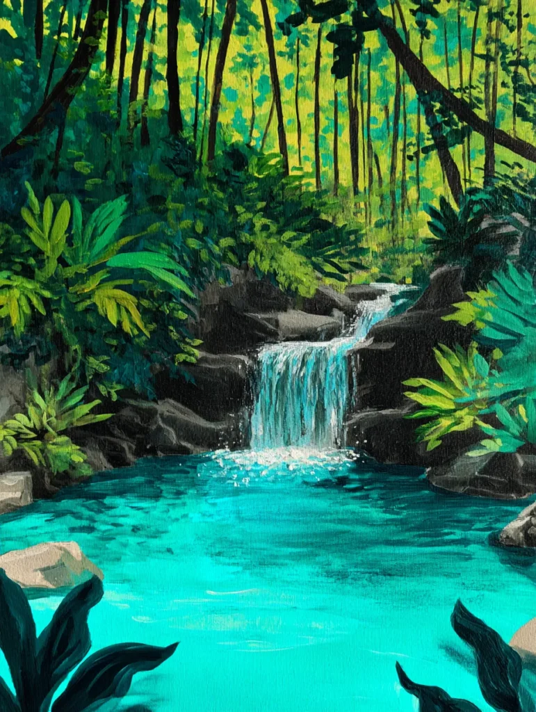 This serene painting captures a hidden jungle waterfall pouring into a brilliant, crystal-clear turquoise pool. The surrounding landscape is dense and vibrant, filled with deep forest greens, lime-toned foliage, and dark rocky outcroppings that frame the cascading water perfectly. Soft, vertical strokes in the waterfall suggest the gentle rush of liquid, while the pond surface below remains calm and reflective. The composition uses a strong contrast between the dark, shadowy trees in the background and the luminous, glowing blues of the water, creating a peaceful and refreshing scene that feels like a private escape.