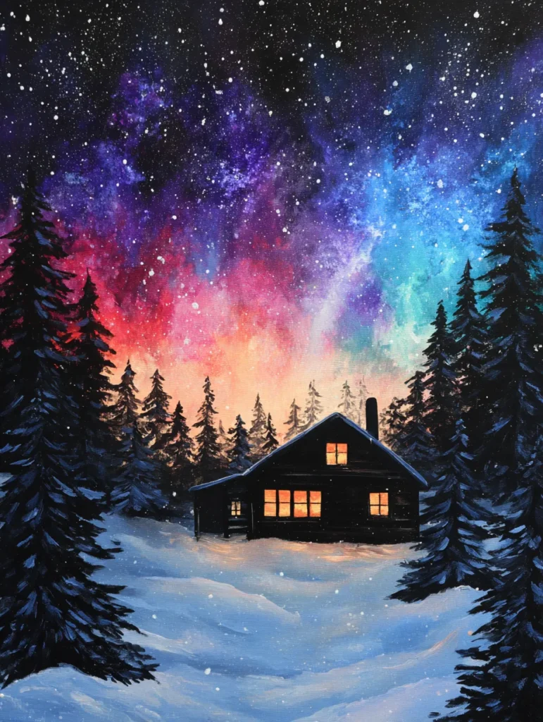 This breathtaking scene centers on a rustic, dark cabin tucked away in a snowy forest, with warm light glowing invitingly from its windows. The night sky above is the real showstopper, featuring a vibrant, swirling aurora borealis in shades of deep purple, electric blue, and fiery orange. Tall, snow-dusted pine trees stand as silent sentinels on either side, framing the cabin and adding a sense of depth to the snowy foreground. The contrast between the cool, crisp winter blues of the snow and the warm, intense colors of the sky makes this painting feel like a magical, quiet night in the wilderness.