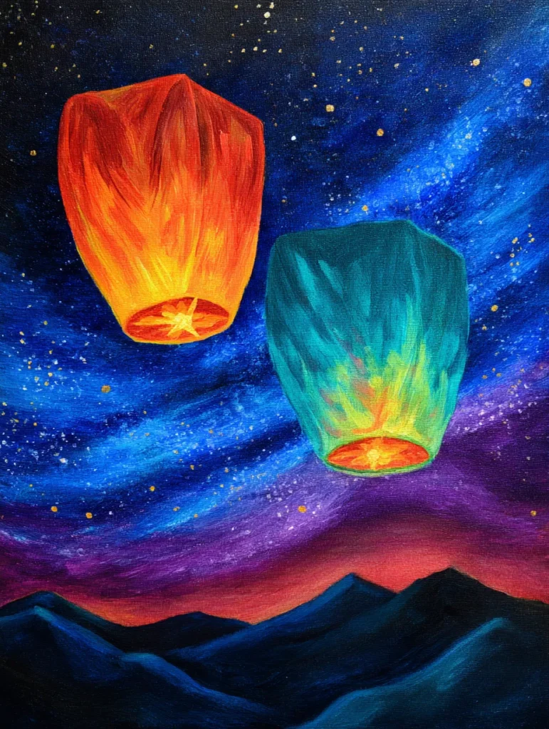 Two radiant floating lanterns take center stage in this enchanting scene, glowing in warm orange and cool teal hues against a vast, starry backdrop. The sky is a masterful blend of deep midnight blue transitioning into hints of purple and red near the horizon, where dark, jagged mountain silhouettes provide a sturdy anchor. Splatters of paint mimic distant constellations, adding a whimsical touch to the expansive night air. Subtle brushstrokes on the paper lanterns themselves hint at a flickering internal light, bringing a soft warmth to the composition.