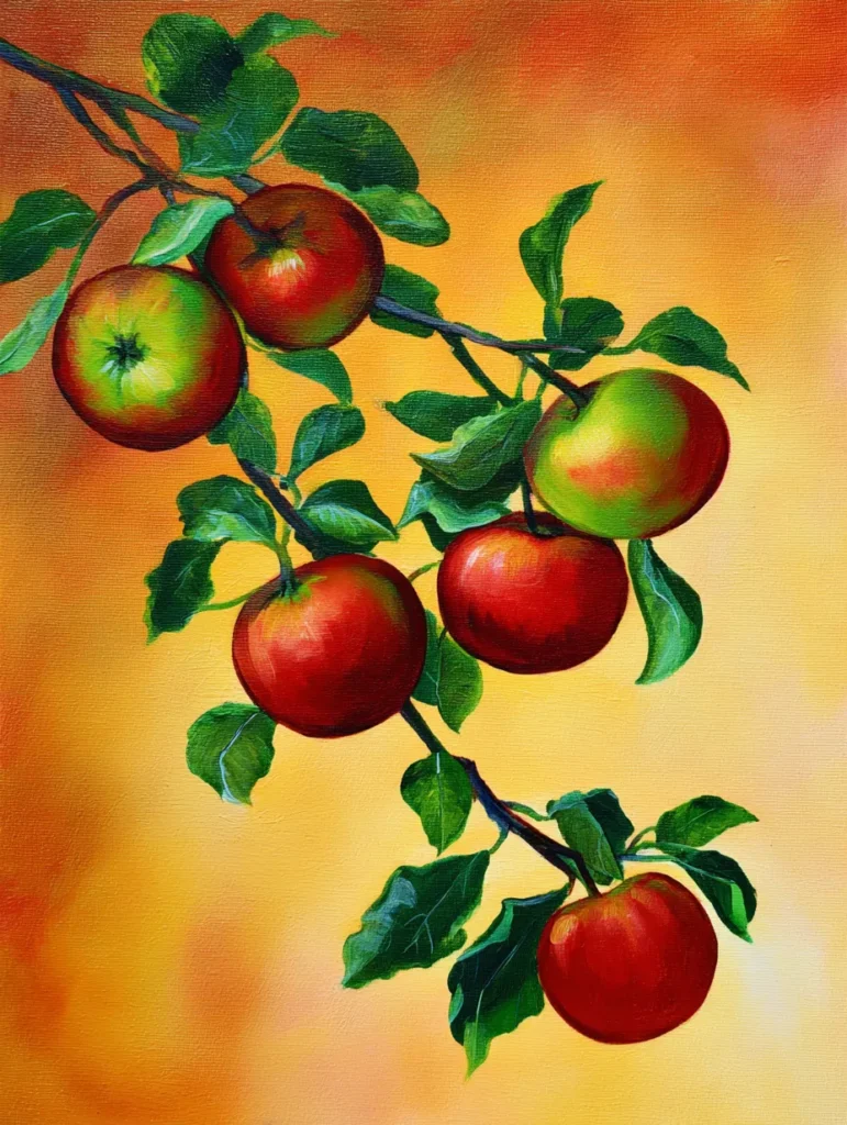 This painting features a lush, heavy branch sagging under the weight of several ripe apples, their skins a beautiful mix of deep crimson and bright lime green. The leaves are painted with rich emerald tones and crisp highlights that make them look fresh from the orchard. A warm, golden-orange gradient background provides a soft glow, making the fruits stand out as the main attraction. The overall layout is balanced and elegant, with the natural curve of the branch leading the eye across the canvas in a gentle, rhythmic flow.
