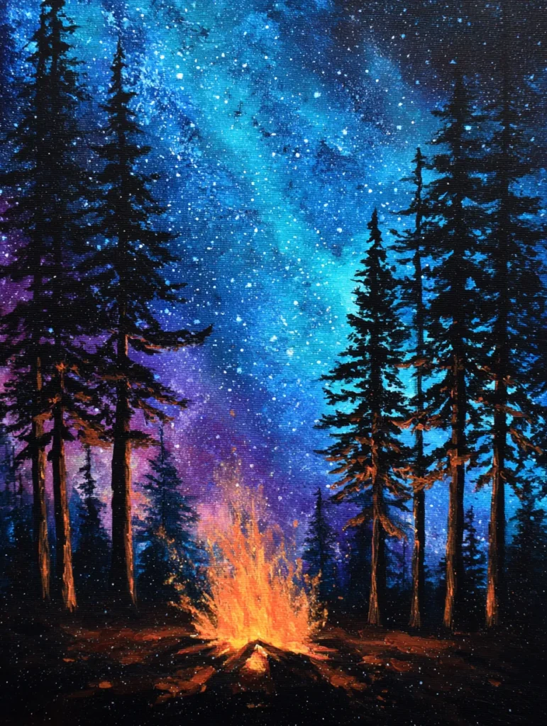 This scene captures the magic of a quiet night in the woods with a crackling campfire casting a warm glow onto the towering silhouettes of pine trees. The background features a breathtaking galaxy of deep blues, purples, and electric teals, speckled with tiny dots that bring the night sky to life. Strong vertical lines from the evergreen trunks create a sense of depth, while the bright orange and yellow flames provide a sharp, cheerful focal point in the bottom center. The contrast between the cool tones of the cosmos and the fiery heat of the hearth makes the whole composition feel vibrant and alive.