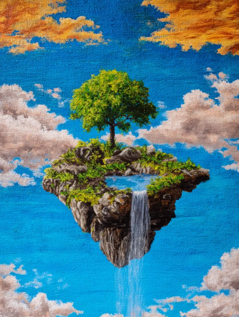 This imaginative design highlights a small, rocky island suspended in a bright blue sky, complete with a lush green tree and a sparkling pool that spills over into a gentle waterfall. The island is detailed with rugged textures, while the surrounding fluffy white clouds and golden-tinged upper clouds add a dreamlike quality to the entire composition. Light shades of blue paint the sky, providing a vibrant contrast to the earthy tones of the terrain and the intense green of the foliage. The waterfall adds a sense of vertical movement, drawing the eye down from the peaceful summit to the airy space below.