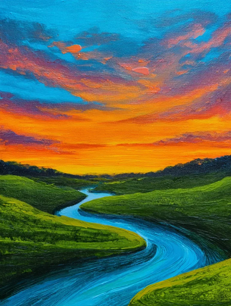 This stunning landscape features a winding blue river carving its way through rolling hills of deep, textured green grass. The sky is an absolute showstopper, filled with dramatic layers of bright orange, fiery red, and cool cyan clouds that mirror the energy of the sunset. Thick, visible brushstrokes give the terrain a tangible, tactile quality, making the valley feel lush and full of life. The river itself uses lighter and darker shades of blue to create a sense of movement, guiding the viewer from the bottom corner right toward the distant, soft horizon.