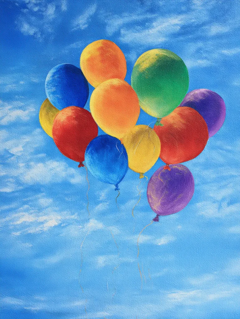 This cheerful painting features a cluster of vibrant, multicolored balloons drifting through a bright, wispy blue sky. The balloons are painted in a rainbow of shades, including red, orange, yellow, green, blue, and purple, each with subtle highlights that give them a rounded, puffed appearance. Delicate, thin lines dangle from the base of the bunch, suggesting they are floating upward against the light, cloudy background. The composition is clean and focused, keeping the energy light and playful, while the soft sky provides a beautiful, airy backdrop that makes the saturated colors stand out.