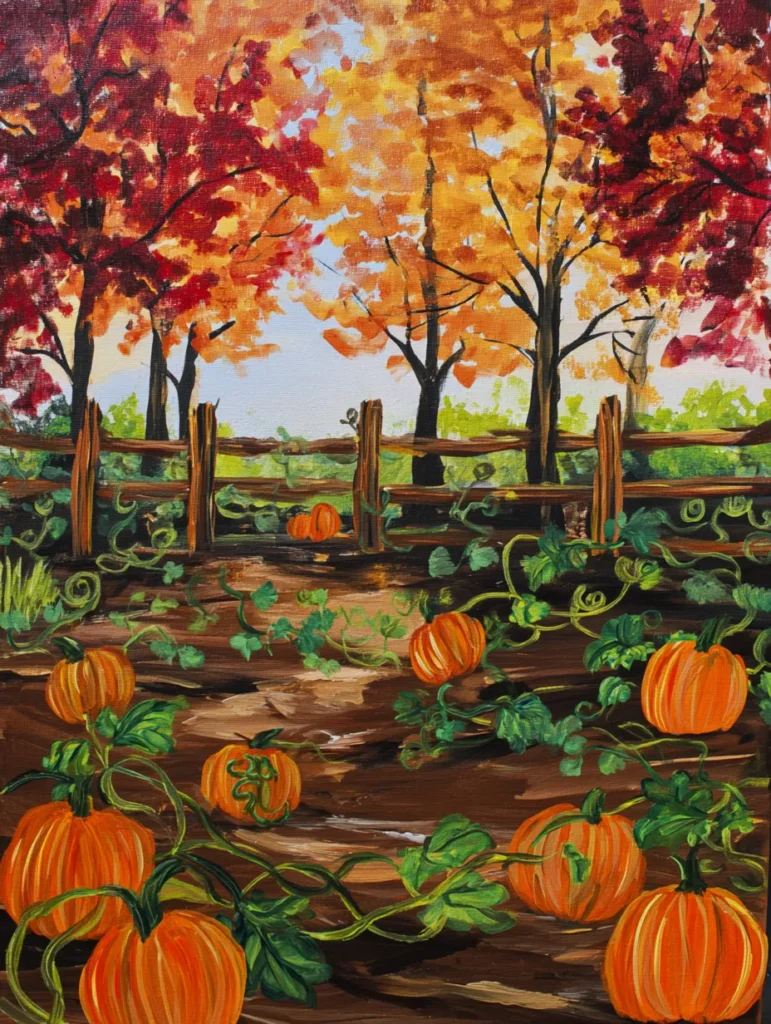 This cozy scene brings the essence of fall to life with a bountiful pumpkin patch framed by a weathered wooden fence and trees glowing in fiery reds, oranges, and golden yellows. The pumpkins sit scattered across the rich brown earth, accented by swirling green vines and textured leaves that add a natural, wild feel to the foreground. Soft light filters through the autumn canopy, creating a gentle warmth that contrasts beautifully with the deep, earthy tones of the soil. The overall composition feels inviting and grounded, capturing that perfect crisp afternoon spent wandering through a quiet harvest farm.