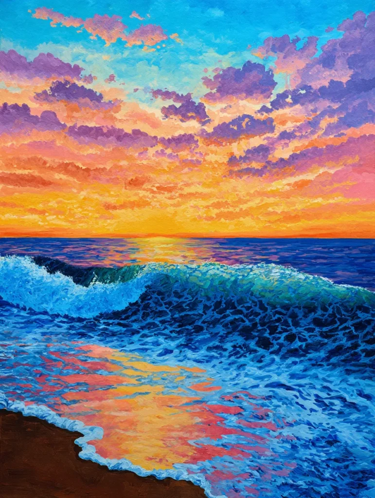 This vibrant painting includes a brilliant golden hour sky filled with fluffy, colorful clouds in shades of purple, pink, and bright orange. Below the horizon, the deep blue ocean waves roll toward a dark sandy shore, catching the warm reflections of the setting sun in the foamy water. Strong, expressive brushstrokes create a sense of texture in both the clouds and the crashing surf, giving the entire canvas a lively, energetic feel. The contrast between the cool tones of the sea and the fiery warmth of the sky makes the composition pop with natural radiance.