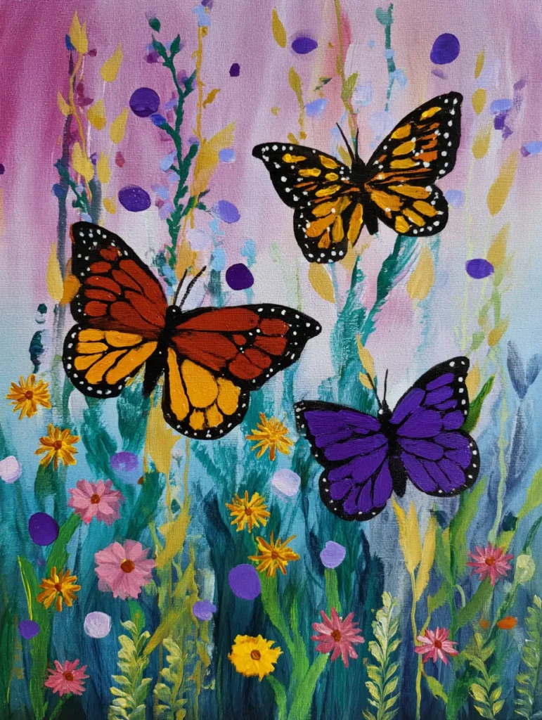 This whimsical scene is packed with life as three butterflies dance above a vibrant, impressionistic meadow. The background is a soft blend of pastel pink and blue, creating a dreamy, hazy atmosphere that makes the sharp details of the butterflies stand out. Down below, the meadow is a riot of color, with tiny yellow wildflowers, pink daisies, and textured green foliage painted in loose, expressive strokes. Even the butterflies get to play with contrast, featuring striking orange, yellow, and deep purple tones that make them look like they are ready to flutter right off the canvas.