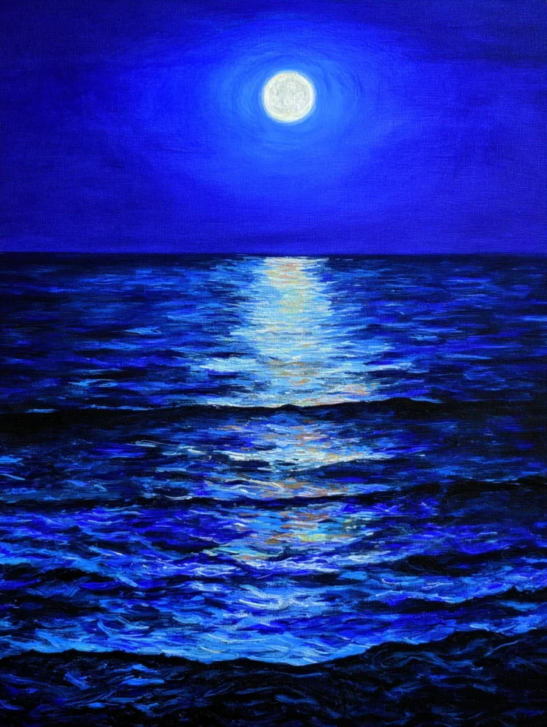 This moody piece focuses on the quiet beauty of a full moon glowing over dark, rhythmic waves. The entire canvas is drenched in varying shades of blue, ranging from deep midnight tones to bright electric highlights that shimmer where the moonlight hits the water. Instead of smooth blending, the waves are built with short, visible brush marks that give the ocean a sense of constant movement and depth. A bright, vertical reflection stretches from the horizon toward the shore, providing a soft white glow that anchors the composition and draws the eye right through the center of the dark landscape.