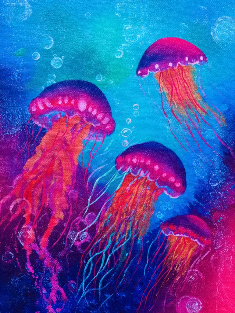 Trying my hand at painting these neon jellies is such a blast because you can totally abandon realism and just lean into the fun, trippy colors. It is incredibly satisfying to let your brush flick across the canvas to form those trailing tentacles, and since they are so fluid, you do not need to stress about making them look precise. This project brings such a cool, upbeat energy to your art space, and it is a fantastic way to break out of your comfort zone. I love how this design turns simple shapes into something that feels like it is glowing from within.