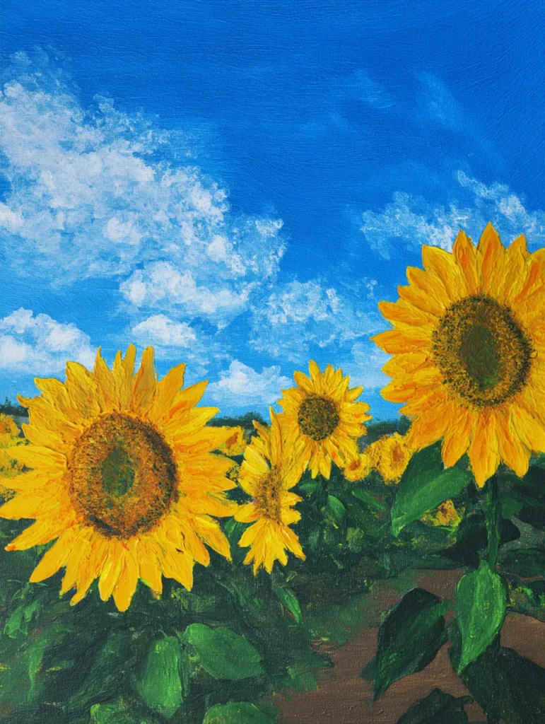 This cheerful composition captures a vibrant field of sunflowers reaching toward a brilliant blue sky filled with fluffy white clouds. The sunflowers are the clear stars of the show, rendered with thick, textured yellow brush strokes that give their petals a sense of weight and realism. Deep green foliage at the base grounds the painting, while the rich, golden centers of the flowers provide a beautiful contrast against the bright azure background. The overall layout is open and airy, perfectly mimicking the feeling of a warm, breezy afternoon spent walking through a summer meadow.