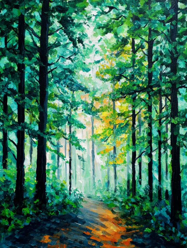This enchanting design features a winding trail leading deep into a lush woodland filled with towering trees. Bright emerald and lime green leaves are created with dappled sponge-like brush strokes that allow bits of golden light to peak through the canopy. Darker vertical lines define the sturdy tree trunks, while the forest floor is dappled with warm orange highlights and deep shadows to suggest sunlight hitting the ground. The composition uses a strong central perspective that pulls your eye right into the heart of the misty green wilderness.
