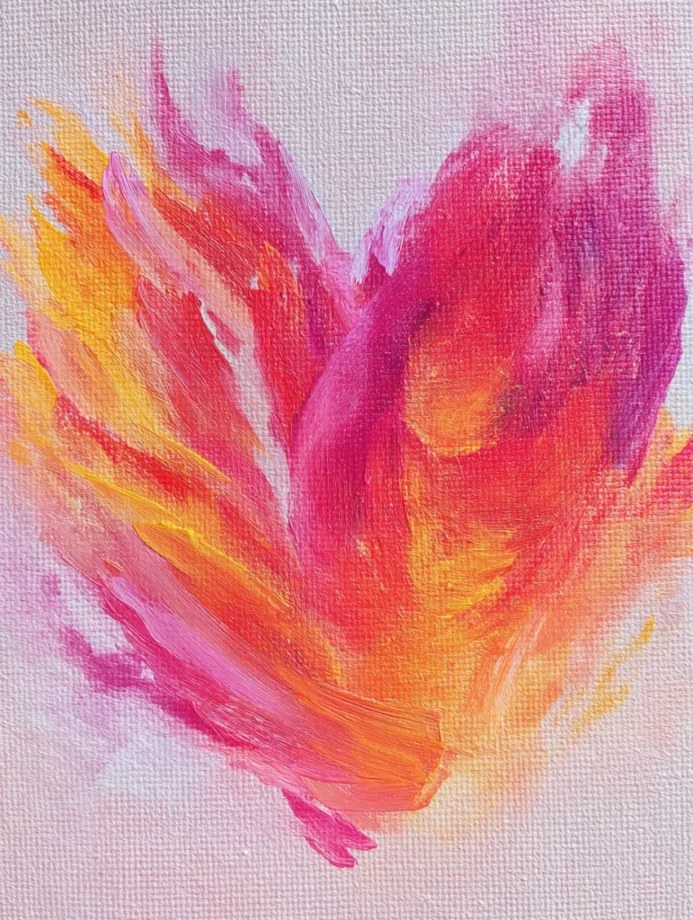 This vibrant piece features a bold and expressive heart shape composed of energetic upward sweeps of color. Brilliant shades of magenta, fiery orange, and sunny yellow blend together through thick and visible brush strokes that give the design a sense of warmth and movement. The composition is centered against a soft and airy pale pink background, which allows the intense hues of the heart to take center stage. The overall layout feels light and modern with an emphasis on texture and raw emotion rather than perfect lines.