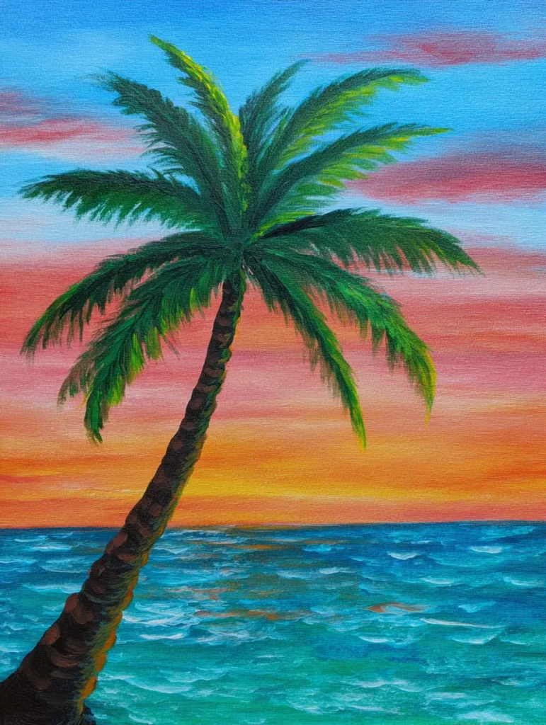 I love this design because it feels like a mini getaway that you can create in just one sitting. It is such a rewarding project to try since those ocean waves don’t have to be perfect to look incredibly effective and professional. You will find that painting the palm fronds with quick, flicking motions is surprisingly meditative and helps you let go of any perfectionist tendencies. Hanging this on your wall will instantly bring those calm, salty vacation vibes into your favorite room.