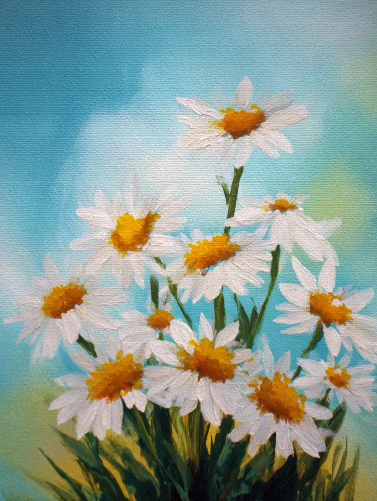 This bright and airy design features a cheerful cluster of white daisies with textured golden-yellow centers. The petals are applied with short confident dabs that give each bloom a unique personality against the soft turquoise and pale yellow background. Long, slender green stems anchor the bouquet at the bottom, while the dreamy sky-blue tones in the upper corners create a sense of an open summer field. The composition feels light and organic with the flowers filling the frame in a natural upward motion.