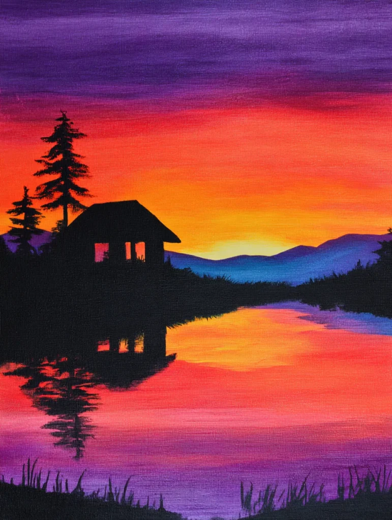 I admire how this piece captures such a peaceful and quiet moment in time. It is an incredibly satisfying project to try because the dark silhouettes are so forgiving and hide any little wobbles or mistakes underneath. You will have the best time blending those juicy sunset hues and seeing how a few simple black shapes can transform the canvas into a professional-looking landscape. Recreating this is a fantastic way to bring a sense of cozy cabin vibes and evening stillness into your home decor.