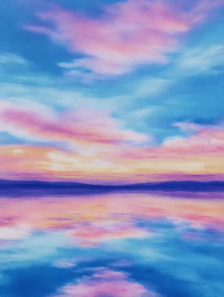 Soft layers of bubblegum pink and lavender clouds stretch across a calming blue sky in this ethereal landscape. The composition is split horizontally by a thin indigo shoreline that separates the vast sky from its perfect reflection below. Gentle horizontal brush strokes create a glassy effect on the water, while the clouds are rendered with soft dabbing motions to give them a fluffy and weightless appearance. The layout is wonderfully symmetrical, which brings a sense of total harmony and balance to the entire scene.