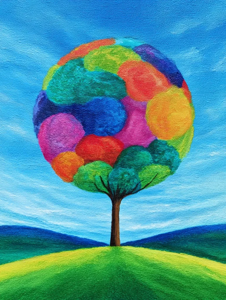 Whimsical Colorful Tree on a Sunny Hill