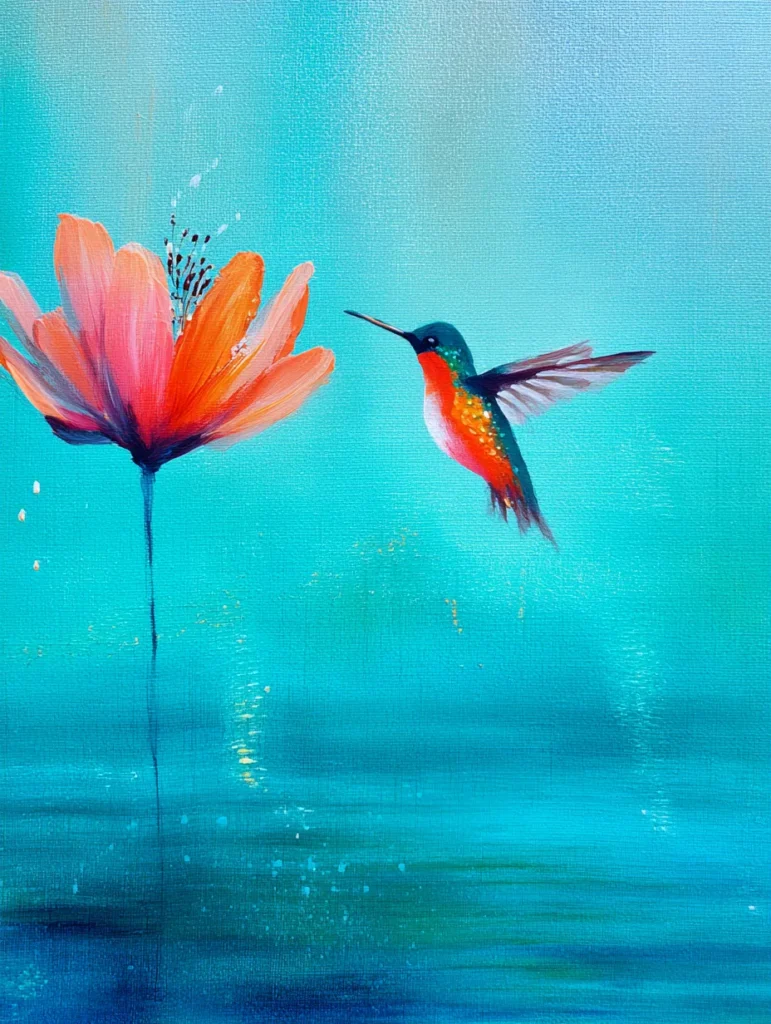 A dainty hummingbird with a brilliant red throat and emerald wings hovers mid-air in this captivating teal-colored scene. The bird is rendered with quick and feathery strokes to suggest the rapid vibration of its wings as it approaches a large orange flower. This bloom stands tall on a thin, delicate stem with its petals flaring outward in various shades of peach and coral. The background is a dreamy wash of turquoise that feels like a misty morning garden while soft golden speckles dance across the layout to add a touch of sparkle.