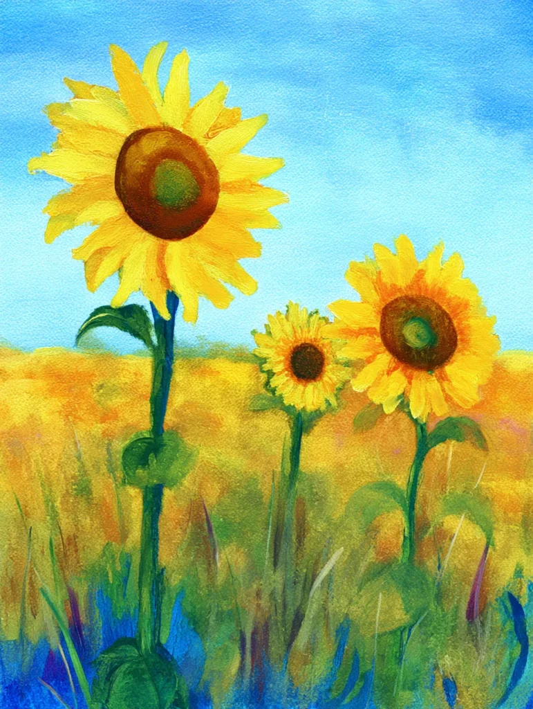 I find myself totally captivated by how these sunny colors can instantly lift a mood. It is such an engaging project because you can be really expressive with your brushwork without needing to capture every single leaf perfectly. There is something incredibly relaxing about swirling those warm oranges and yellows together to create the flower centers. You will love how the bold contrast between the petals and the sky makes your canvas look like a professional summer masterpiece.