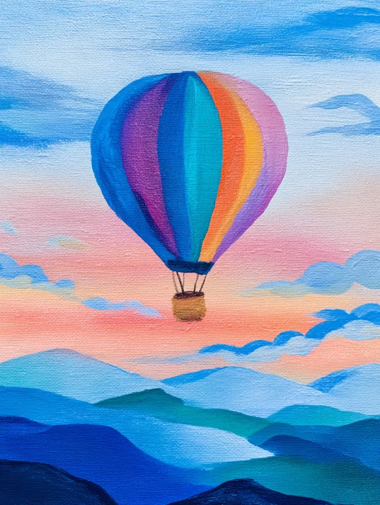 This dreamy design features a colorful hot air balloon floating gracefully above a layered mountain range. The balloon is painted with vertical sections of purple, teal, and orange, creating a lovely focal point against the soft pink and peach sunset sky. Below, the mountains are rendered in various shades of cool blue and deep navy, using horizontal strokes to suggest distance and depth. The layout feels perfectly balanced, with the balloon centered to lead the eye upward through the wispy blue clouds.