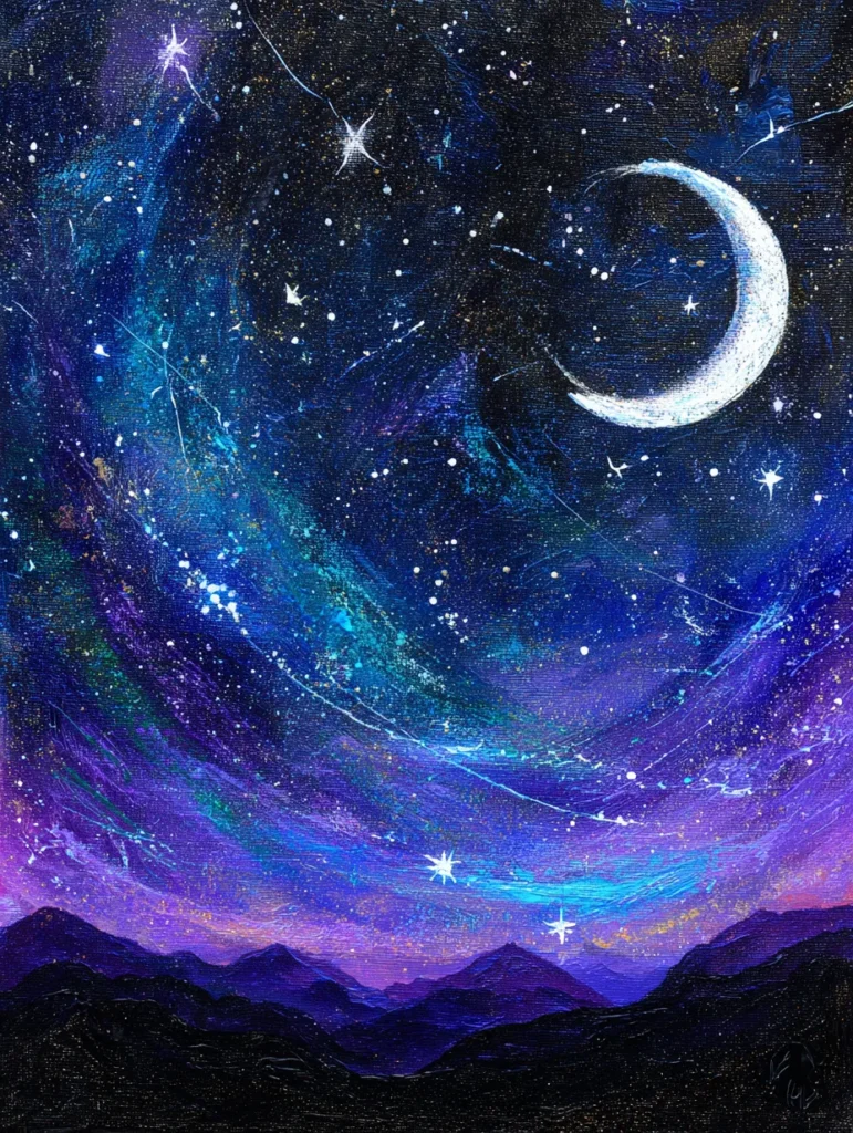 Deep purples and swirling indigos create a mesmerizing galaxy effect in this stunning night sky scene. A bright white crescent moon glows against the dark backdrop, while scattered stars and celestial dust are added with tiny, flickering taps of the brush. The composition uses a circular swirling motion that draws the eye inward towards the center of the cosmos. At the very bottom, thick black and dark violet strokes form a jagged mountain range that grounds the ethereal sky.