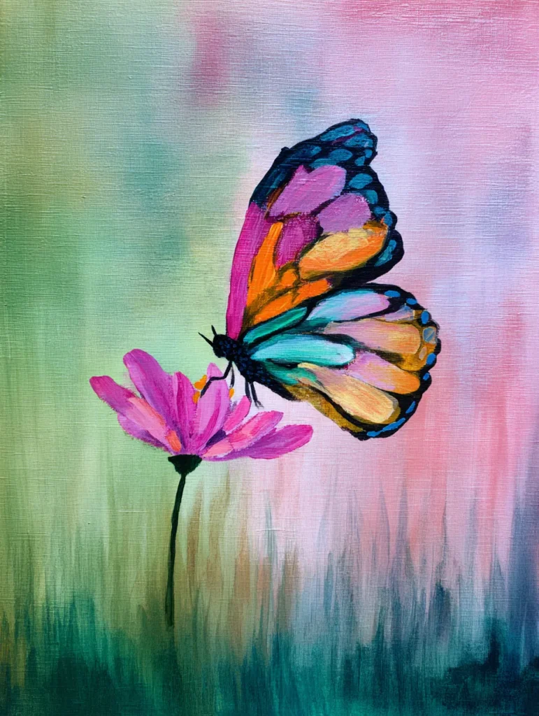 This lovely design showcases a vibrant butterfly with wings full of pink, orange, and teal, landing gently on a bright purple flower. The background is a soft blend of muted greens and rosy pinks created with long vertical brush strokes that give the piece a dreamy, airy feel. With a simple side-profile composition, the butterfly takes center stage as the detailed focal point against the blurry garden backdrop. The layout is clean and balanced, keeping the viewer’s focus right on that sweet moment of nature.