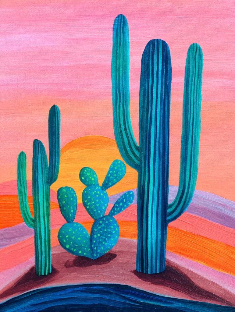 I feel energized by this color palette because it brings such a modern and trendy vibe to a classic desert theme. It is such a rewarding project to try since the cactus shapes are very forgiving and allow you to experiment with different shades of blue and green. You will have a blast layering those bright neon dots onto the smaller cactus to give your painting a bit of personality. Finishing a piece like this feels like a total win because the high contrast makes it look like something you’d find in a high-end boutique.