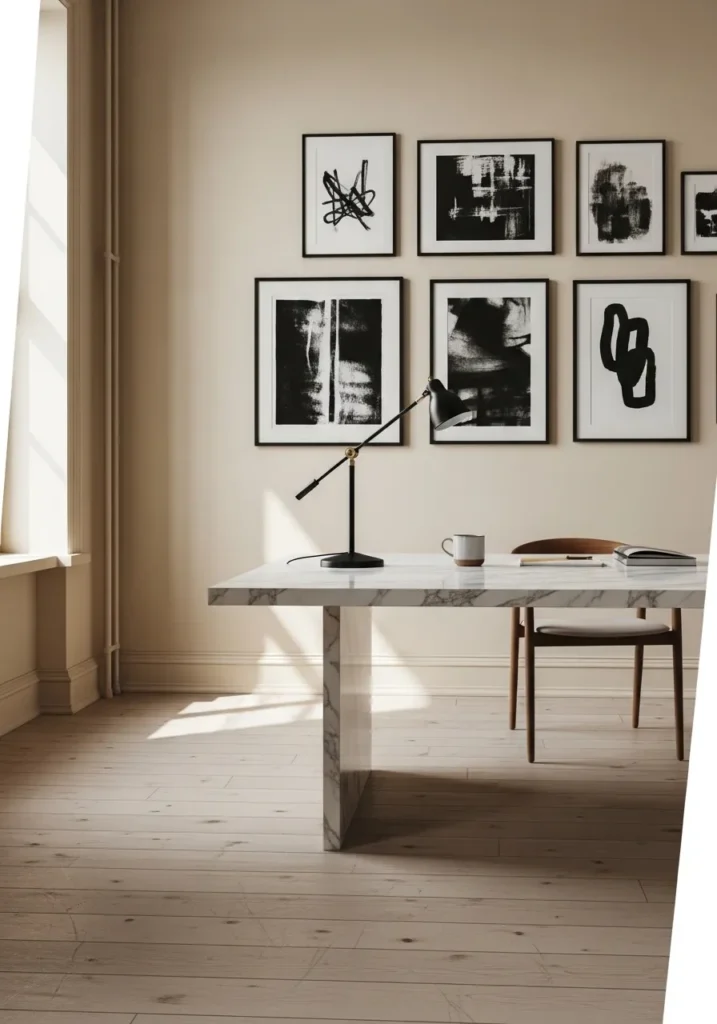 I love how this space proves that neutral does not mean boring. The beige walls create a peaceful backdrop that makes it easier to focus, but the artwork adds just enough edge to keep things interesting. It feels like the kind of office where mornings start slow with a cup of coffee and a clear to do list. To me, this is elegance done in a quiet and confident way, and that is exactly what makes it so beautiful.