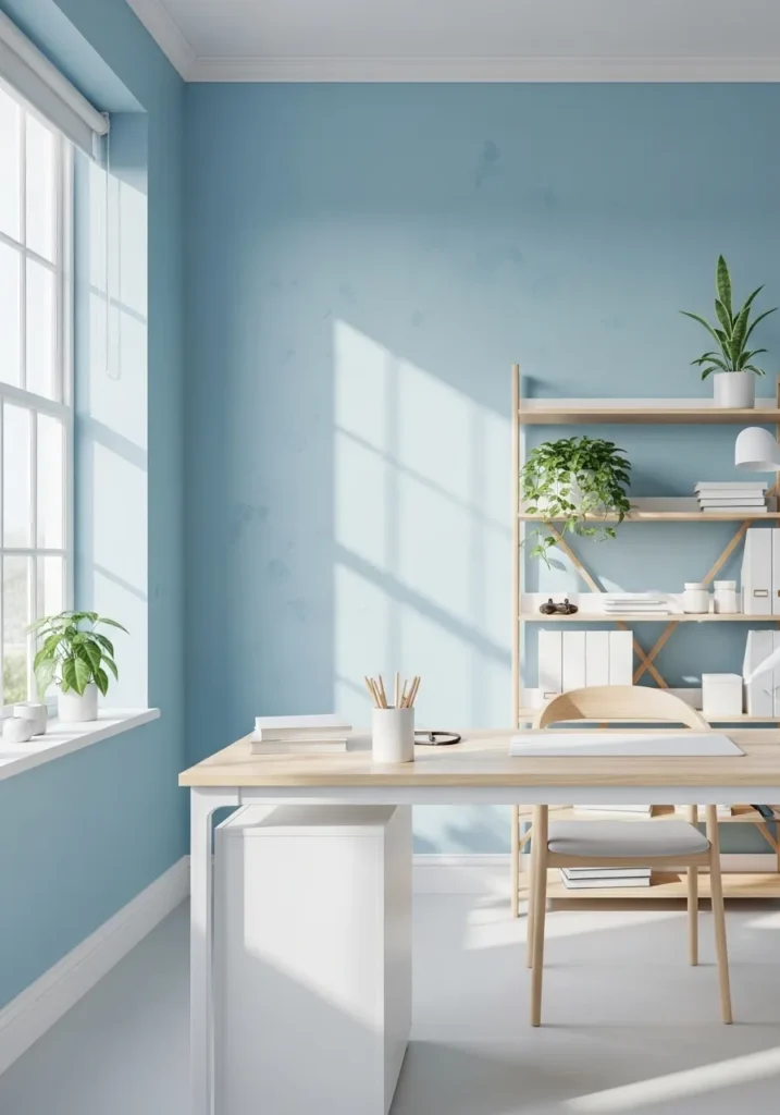 This bright office uses a light sky blue that instantly opens up the room. Large windows flood the space with sunlight, making the walls glow and bounce light around the white desk and shelving. The simple furniture keeps the look fresh and uncluttered, while small plants add a gentle touch of green. The overall vibe is light, clean, and uplifting.