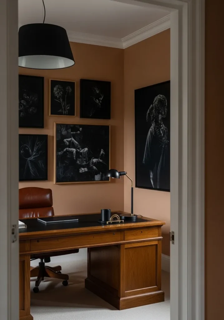 This office embraces warm terracotta walls that bring depth and personality to the space. The earthy tone pairs beautifully with a solid wood desk and darker artwork displayed behind it. Soft lighting from overhead and wall fixtures creates a cozy atmosphere that feels slightly dramatic but still inviting. The color adds richness without feeling heavy.