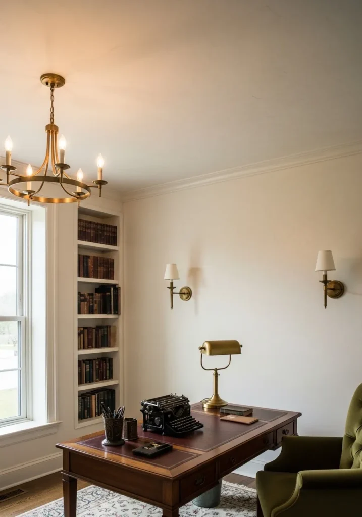 This office keeps things elegant with creamy ivory walls that reflect soft natural light. The light tone enhances the tall windows and classic architectural details, while a traditional wooden desk adds warmth and contrast. Brass wall sconces and a delicate chandelier bring a hint of understated glamour. The color choice keeps the room feeling open and serene.