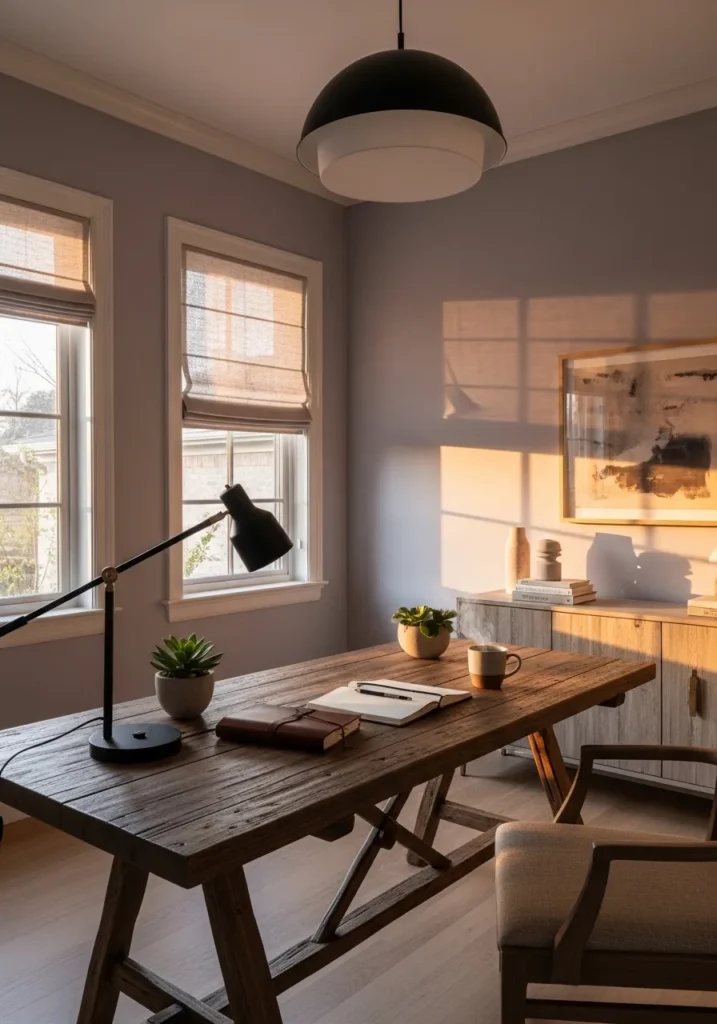 This office is wrapped in a gentle taupe shade that shifts beautifully in the afternoon sun. The warm light streaming through the windows creates soft shadows across the walls and wooden desk, giving the whole space a cozy glow. The rustic style desk with trestle legs adds character, while simple decor keeps the focus on the color and natural textures. The taupe feels neutral but far from flat, especially when paired with warm wood and creamy trim.