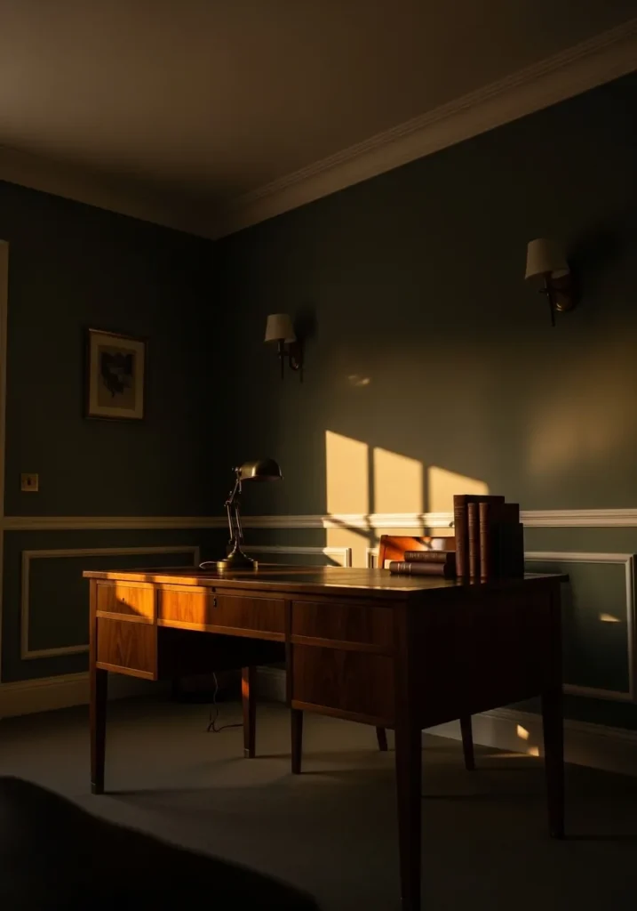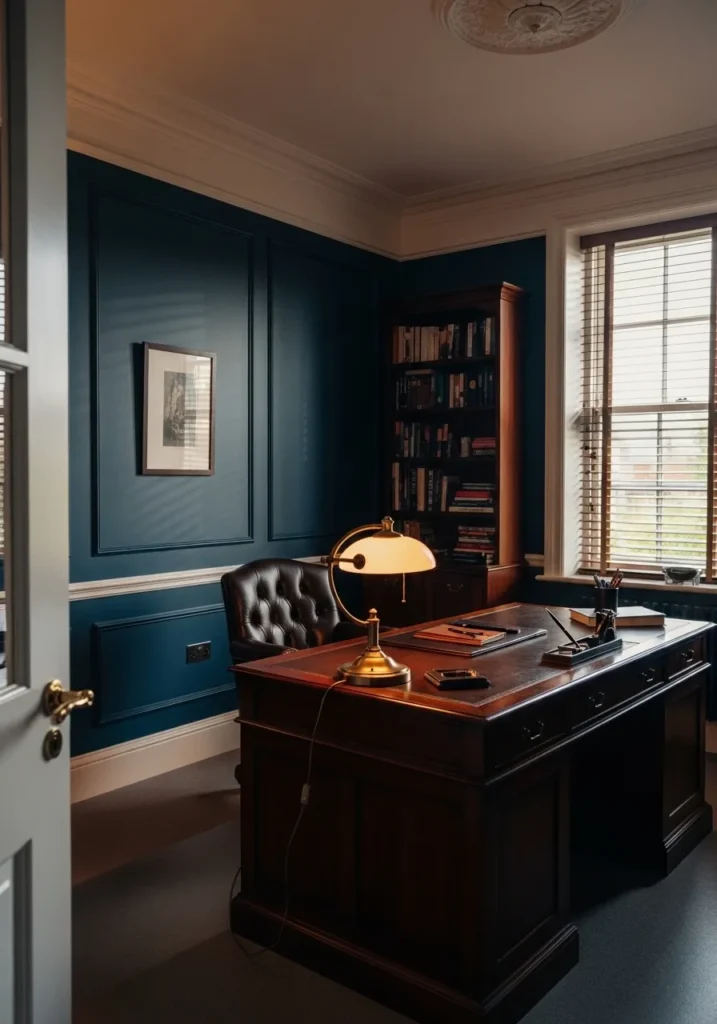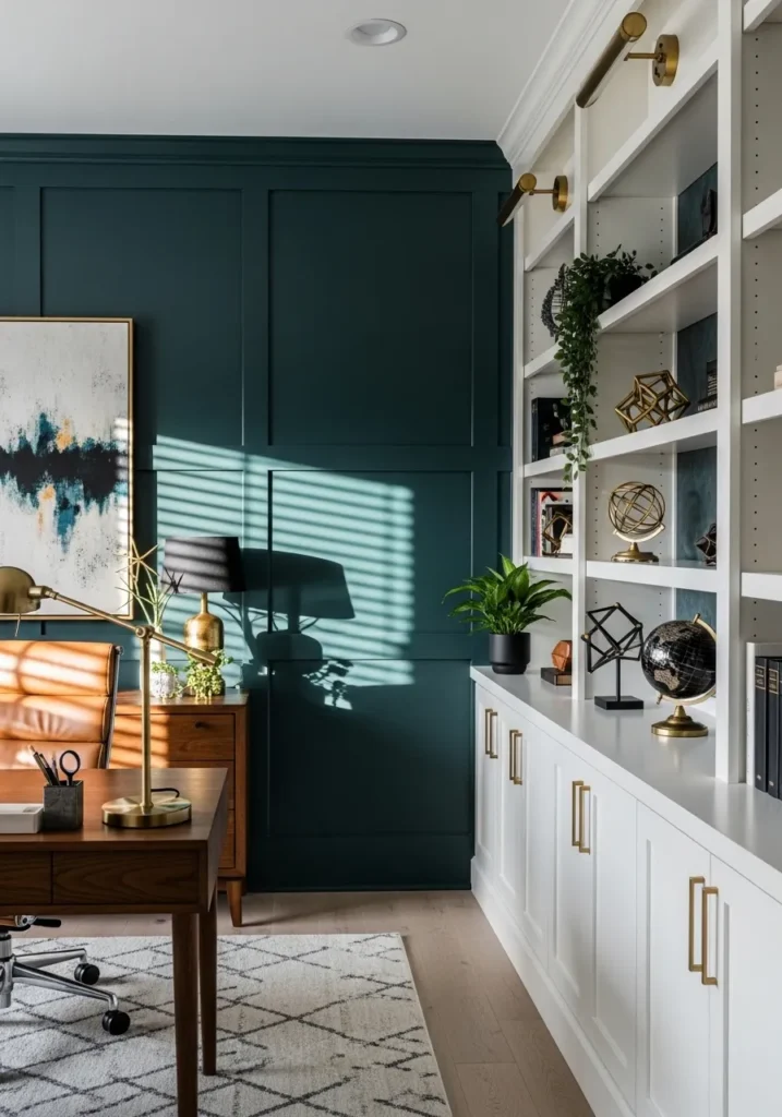 This office embraces a bold deep teal that instantly elevates the entire room. The paneled walls add texture and structure, while the rich color creates a dramatic backdrop for the dark wood desk and leather seating. A classic table lamp casts a warm glow, balancing the coolness of the teal and making the space feel cozy instead of heavy. The large windows with wooden blinds bring in natural light that softens the overall mood.