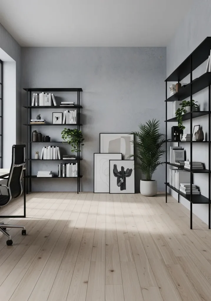 This office features cool light gray walls that bring a clean and modern edge to the room. Black open shelving adds contrast and structure, while pale wood floors keep the space from feeling too stark. The gray backdrop allows framed art and greenery to stand out without overwhelming the design. Large windows keep the room bright and airy.