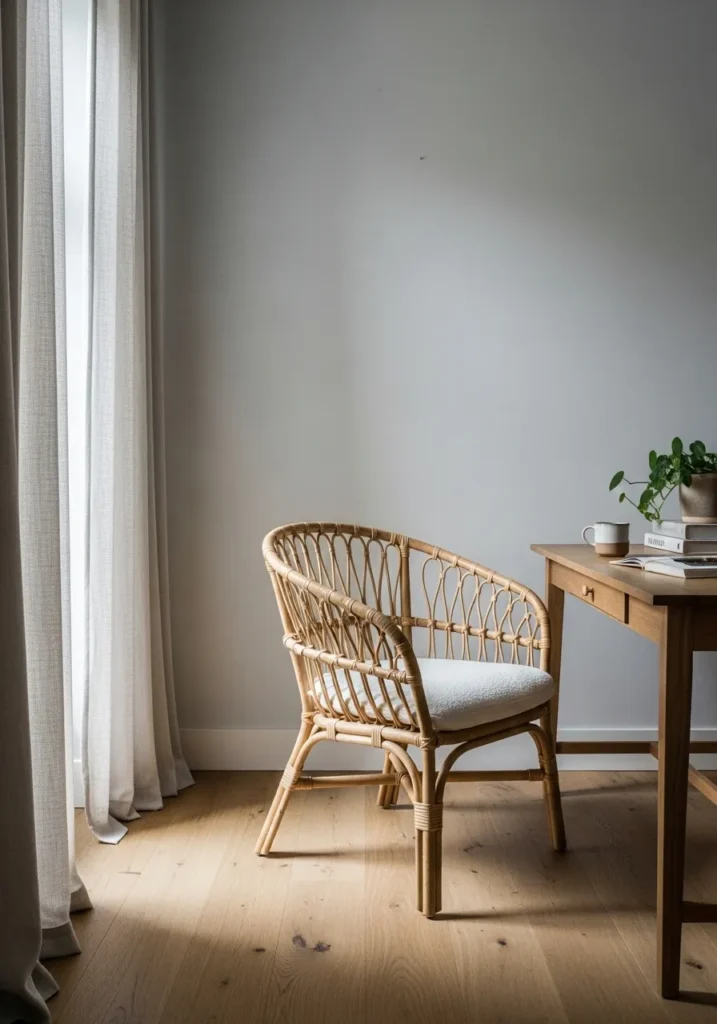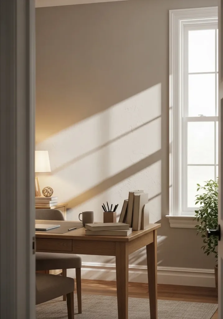 This office corner is wrapped in a soft greige shade that feels calm and quietly refined. The wall color sits beautifully between gray and beige, giving it a warm undertone that works perfectly with the light oak flooring. A simple wooden desk with clean lines keeps the look minimal, while the woven rattan chair adds texture and a relaxed touch. Sheer curtains filter the daylight, creating a gentle glow that makes the entire space feel airy and peaceful.