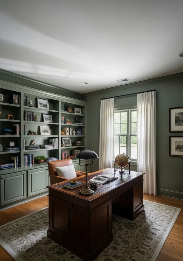 This office wraps the room in a muted sage green that feels both classic and fresh. The built in shelves are painted the same tone as the walls, creating a seamless and cozy look. A rich wooden desk sits at the center, paired with a warm leather chair and soft natural light streaming through tall windows. The layered rug and carefully styled shelves make the room feel lived in and welcoming rather than overly staged.