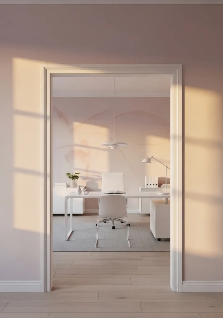 The soft blush walls in this design create a gentle transition into a bright and airy office beyond the doorway. Warm sunlight washes across the paint, highlighting its subtle peach undertones. Inside the office, light furniture and minimal decor keep the look fresh and open. The color feels delicate but not overly sweet, making it a lovely alternative to basic white.